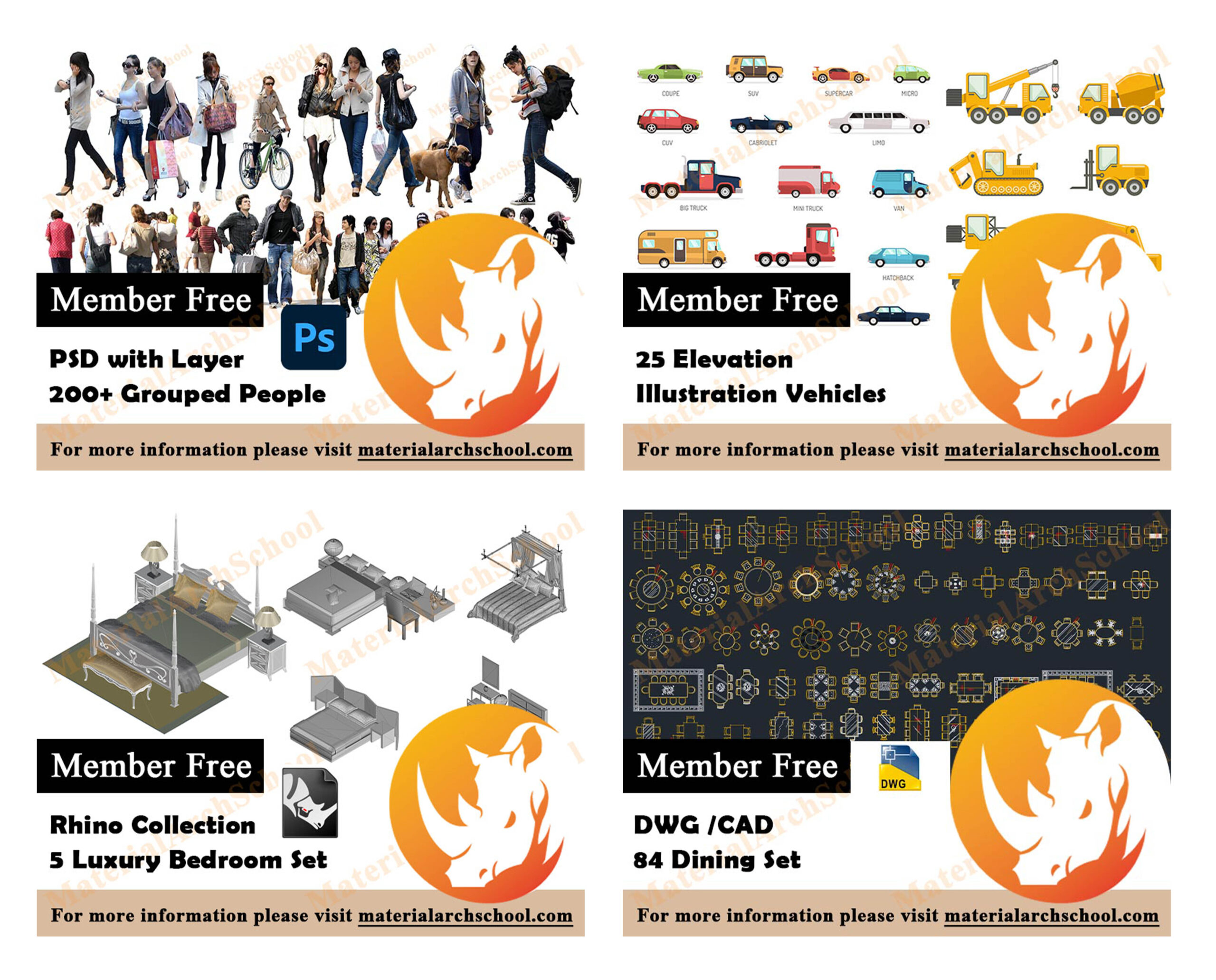 New material added regularly, ranging from 3D Models (Rhino/SU/CAD) to 2D assets (PS/AI/CAD). Find the materials you need FASTER, no more late nights for students and architects!